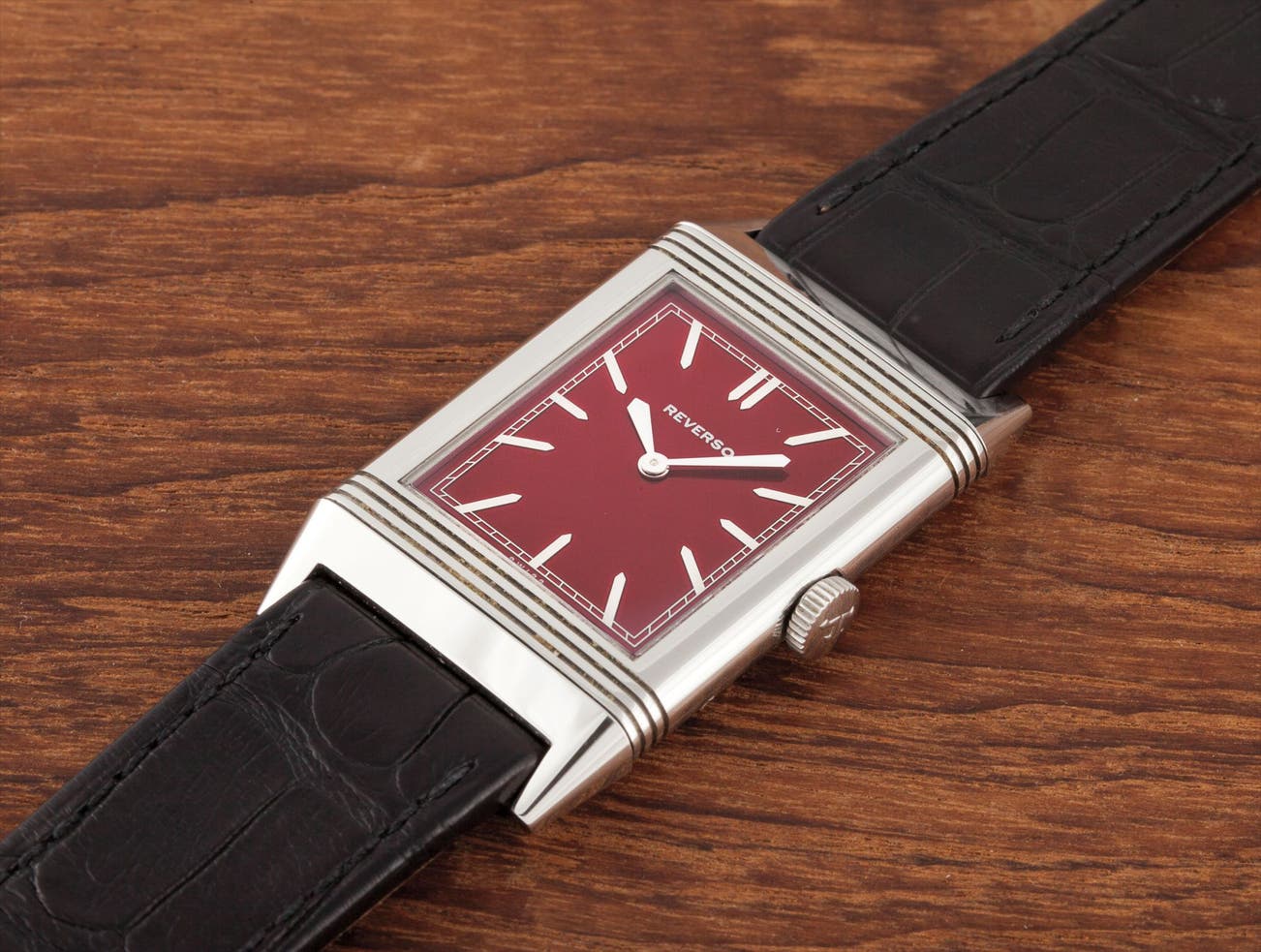 A rare stainless steel special edition reversible wristwatch with red dial