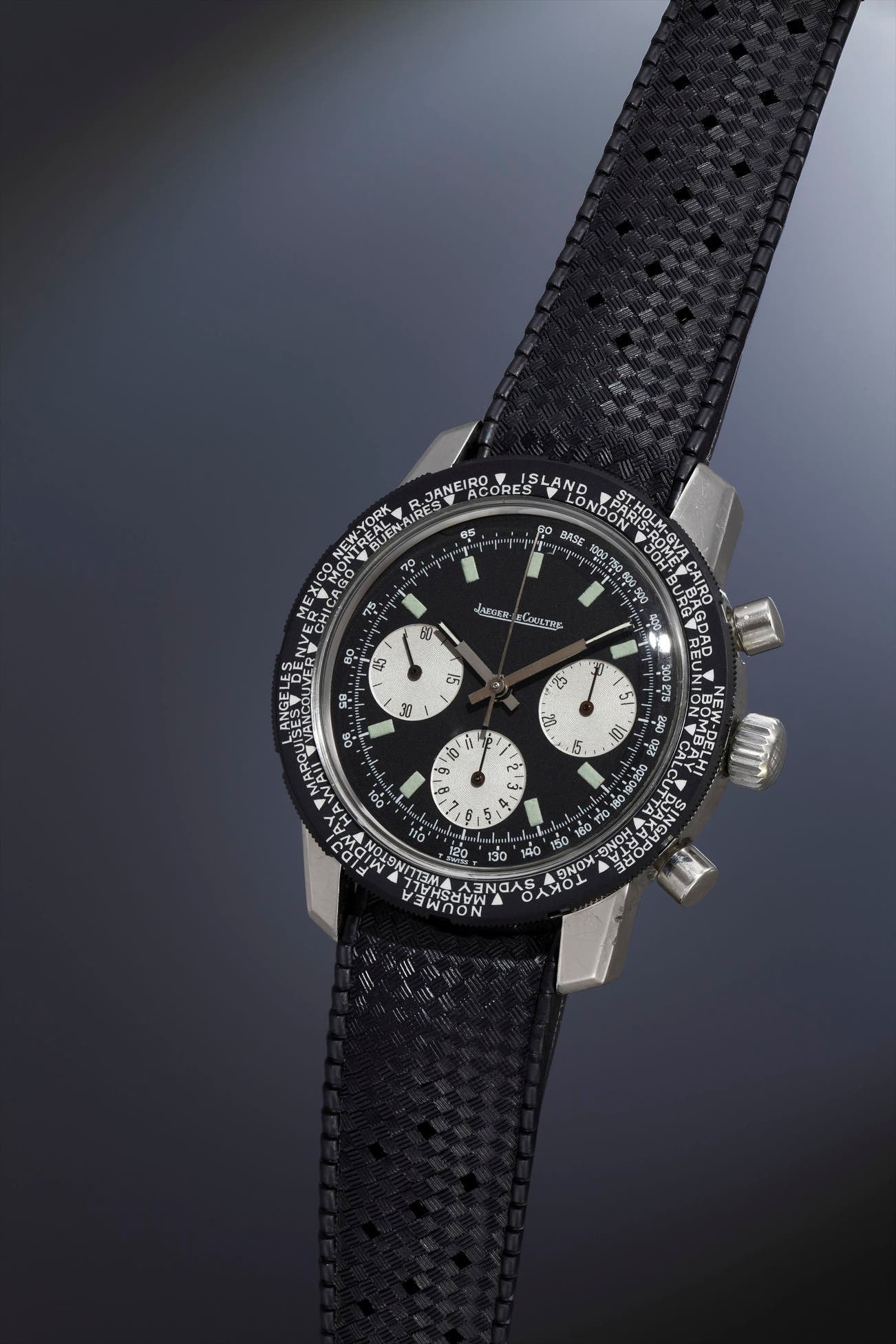 An unusual diving chronograph with world time indicated by its rotating bezel, this uncommon watch is housed in a massive case measuring 40 mm in diameter. Featuring broad, angular lugs, the masculine lines and proportions of the case, combined with its modern styling make it difficult to believe this watch is nearly half-century old. The matte black dial, with its white sub-dials, gives it a sporty aesthetic with great legibility.