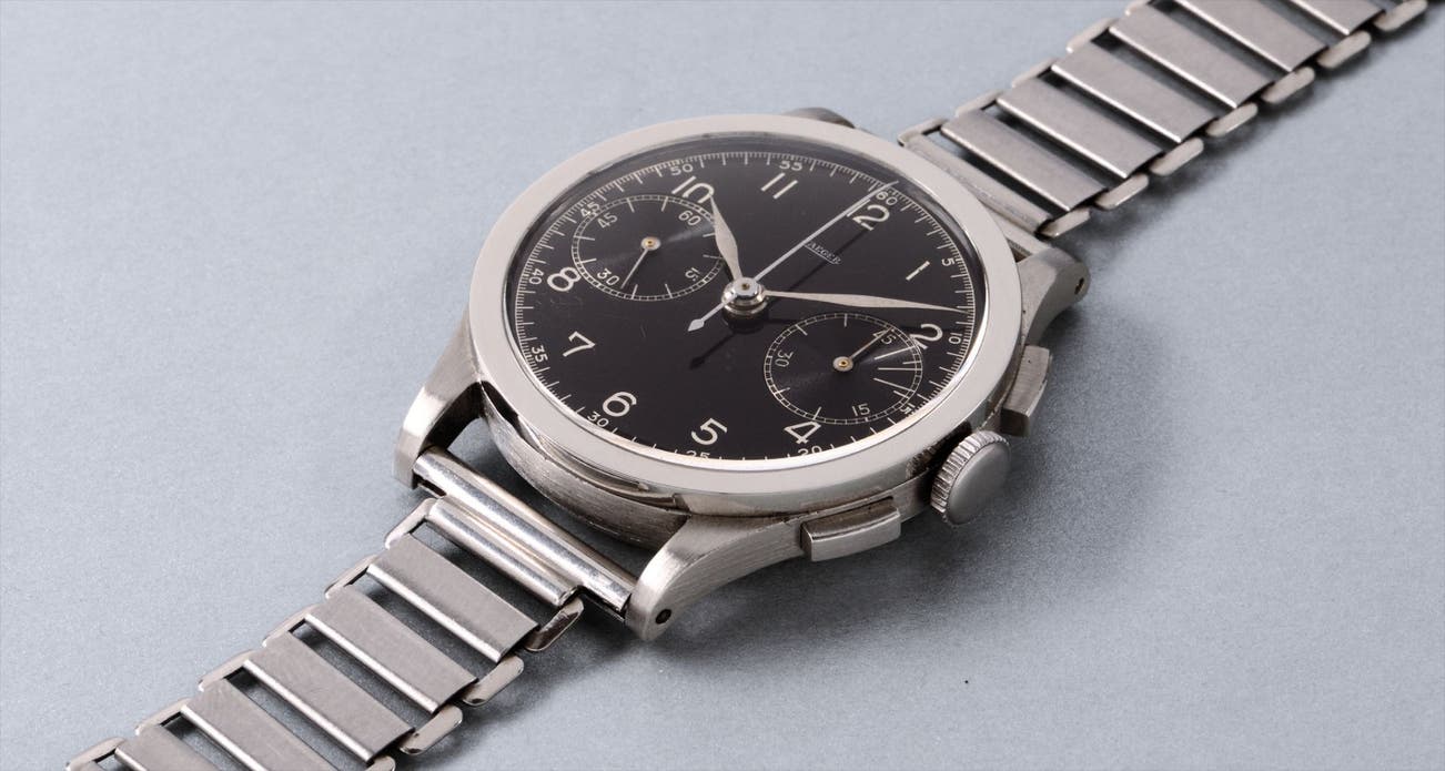 The present lot may be 70 years old, but it remains in pristine unmolested condition. The glossy black dial, with silver printing, glows and radiates light in the most serene way. The chronograph minutes counter features three longer markers indicating the 3,6,9 elapsed minutes. This interesting dial configuration is found on some chronograph dials and used at a time when phone calls in Western Europe were billed in three-minute increments. The large flat bezel serves to further enhance the impression of size, giving the watch a contemporary aesthetic certain to please any vintage chronograph enthusiast.