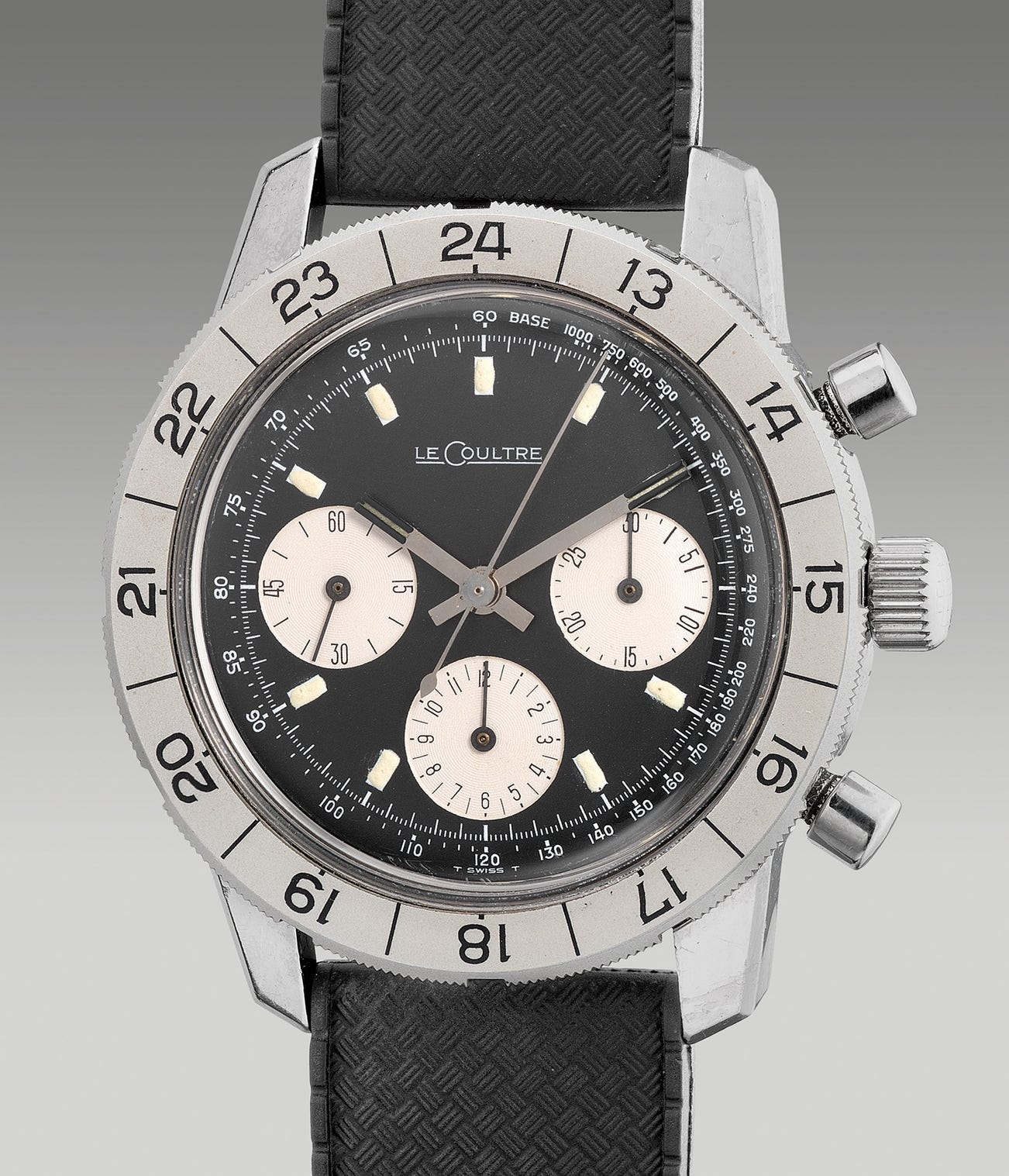 The present example is referred to collectors as “Great White Shark” due to its unusual white aluminium 24-hour bezel fitted with a few rare examples made for possible inclusion for those examples sold to the United States. This example was clearly destined for the US, with its “LeCoultre” signature on the dial and VXN import code on the movement. It is possible that so few were made only a handful were sent to retailers and this is one of those very few.