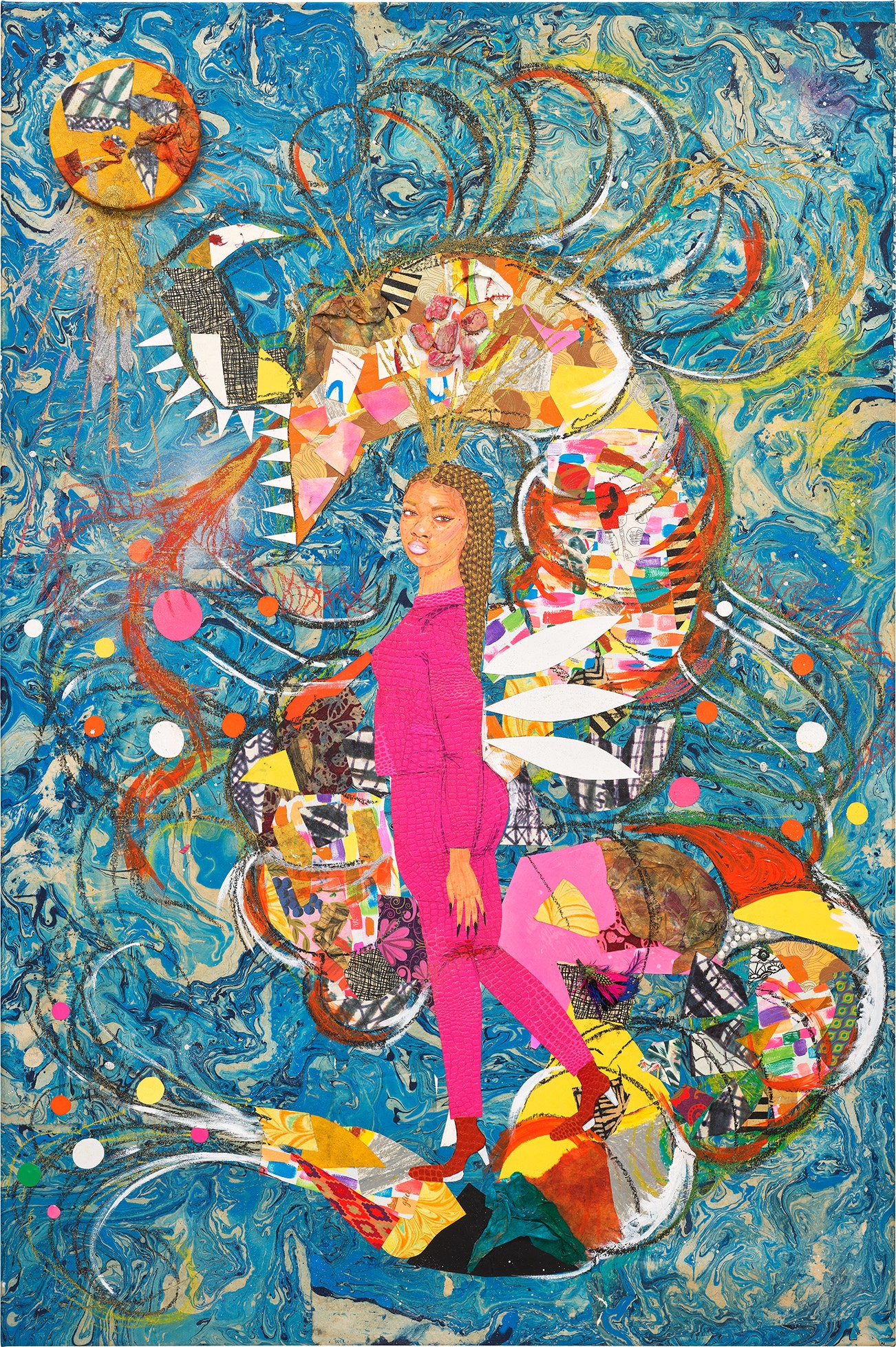 marker, ink, pastel, colored pencil, acrylic, spray paint, glitter, rhinestones, fabric and mixed media collage on canvas
