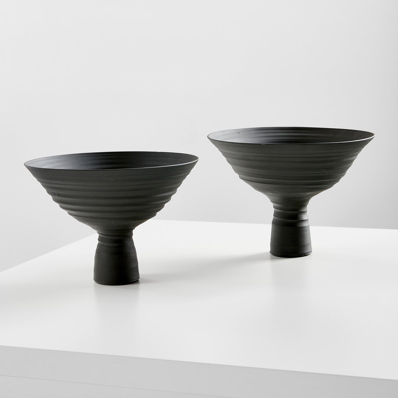 Pennsylvania-born James Makins creates works in ceramic that, as he describes them, “synthesize a complex set of references from the history of ceramics, [fusing] them with contemporary issues in music, dance, painting and sculpture. Through the employment of focused attention, heightened awareness and constant decision making, a vocabulary of mark making is established through gesture, finger pressure and varying wheel speed.” In his early career, Makins studied with Byron Temple, a student of potter Bernard Leach. Similar to his predecessors, Makins became interested in British and Japanese ceramics. He later studied at Cranbrook Academy of Art with Richard DeVore, whose work is also included in the present offering. Over the past four decades, Makins has created a wide body of work in ceramics—from dinnerware services to abstract arrangements of vessel forms—that evidence their meticulous handmade quality. Makin’s work belongs to the Philadelphia Museum of Art and the Los Angeles County Art Museum, among others.