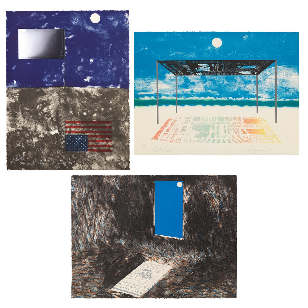 All signed, titled and dated, Mirrored Flag annotated 'artist proof', Moon Beam Mistaken for the News numbered 46/70 and Cold Light numbered 33/70 in pencil and white pencil respectively (there were also 3 or 1 artist's proofs), published by Graphicstudio, University of South Florida, Tampa (with their blindstamp), two framed.