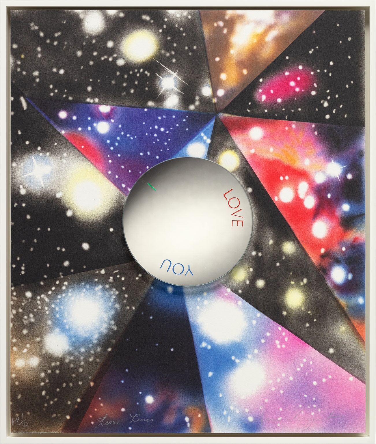 Lithograph in colors, on wove paper mounted to aluminum panel, with etched and hand-colored rotating mirror, contained in the original white painted artist's frame.