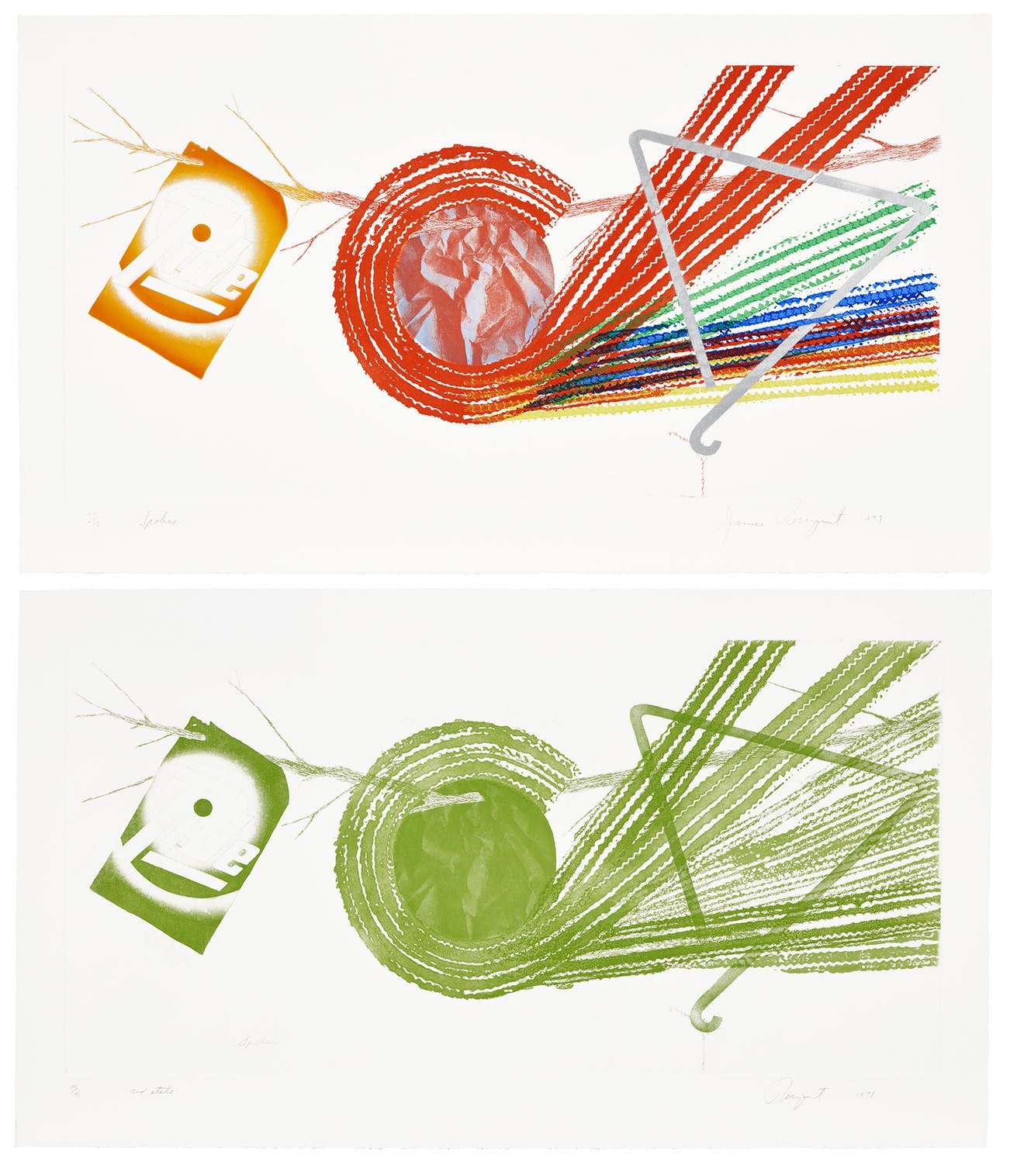 Both signed, titled, dated and numbered 70/78 in pencil (there were also 22 and 10 artist's proofs respectively), Spokes published by Multiples, Inc., New York, Spokes, 2nd State published by Aripeka Limited Editions, Florida, both unframed.