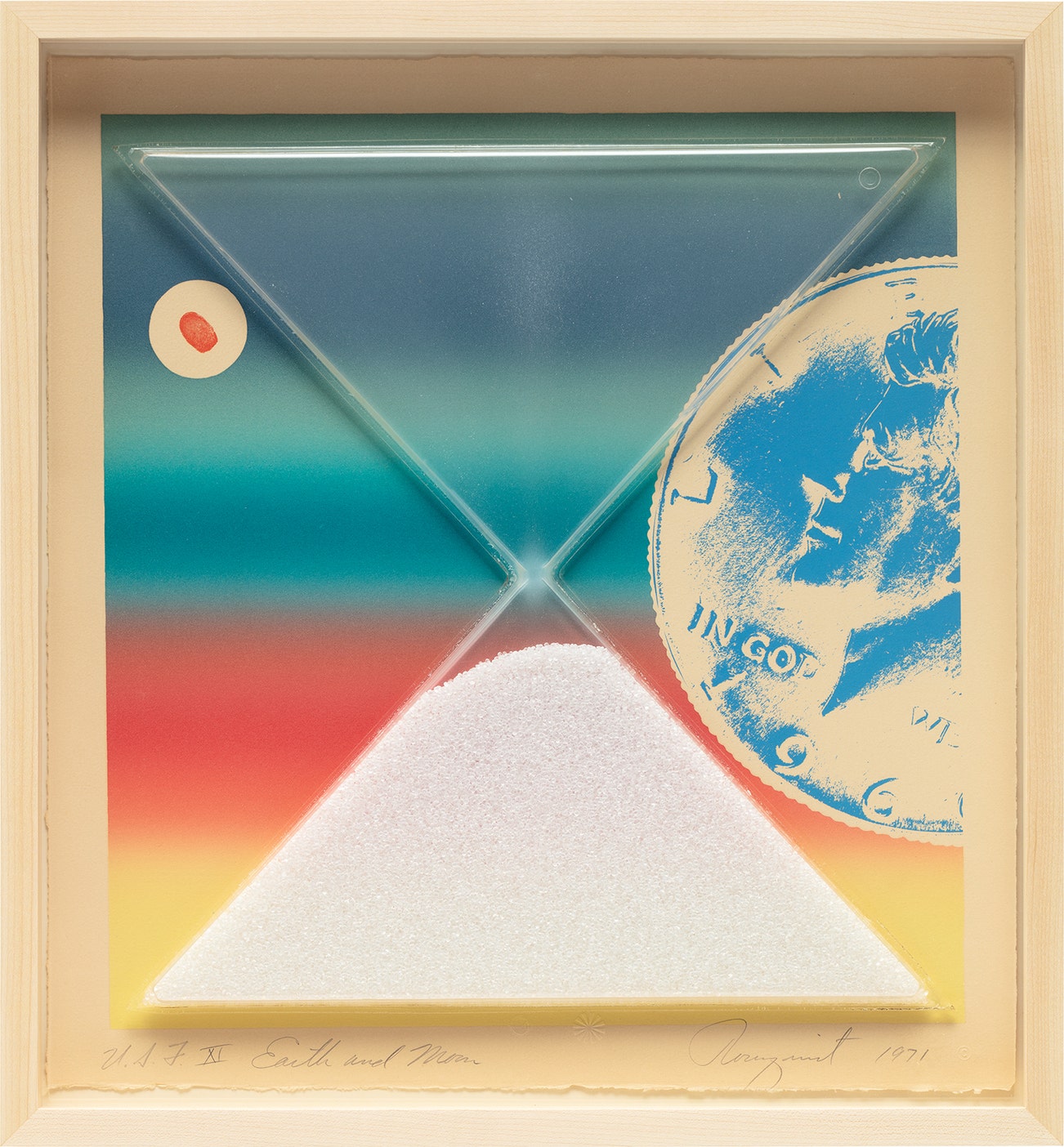 Lithograph in colors, on Arches paper, with full margins, with bead-filled vacuum-formed plastic hourglass collage.