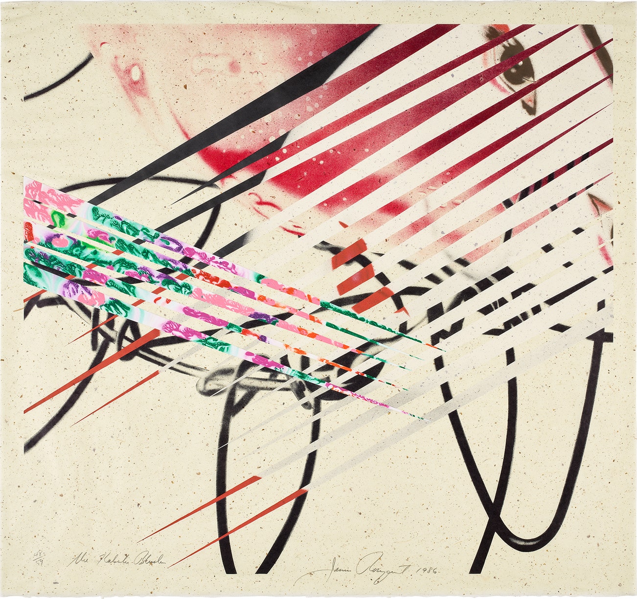 Lithograph in colors, on Chiri Kozo paper, with acrylic monoprint collage in colors, on Somerset Satin paper, with full margins.