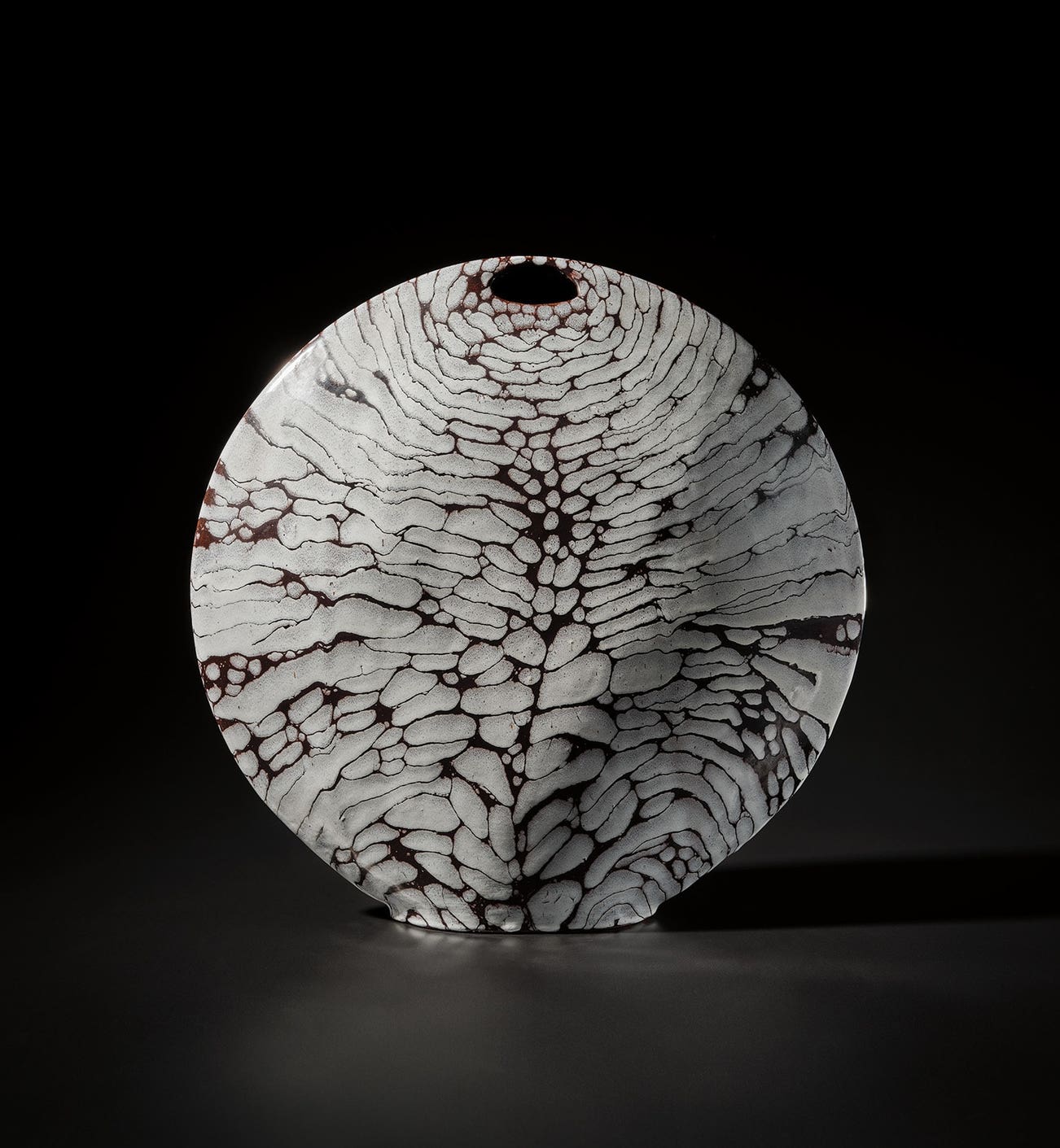 Earthenware, layered white over black glazes with the design carved through.