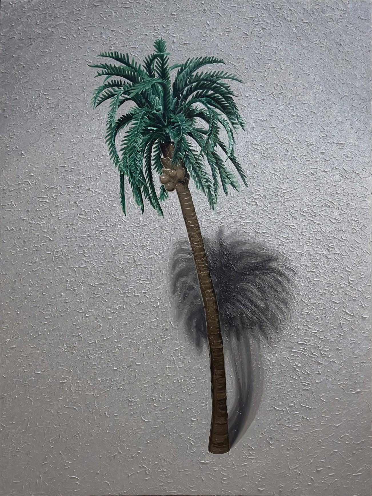 In this artwork, Jan Balquin depicts a plastic scale model coconut tree ordered from China. Portrayed in oil paint on canvas, the artist transforms the coconut tree from a plastic toy into still life subject matter. Here, Balquin examines our current consumerist culture and sheds light on the shift from the natural to the manufactured that has come to characterise contemporary society.