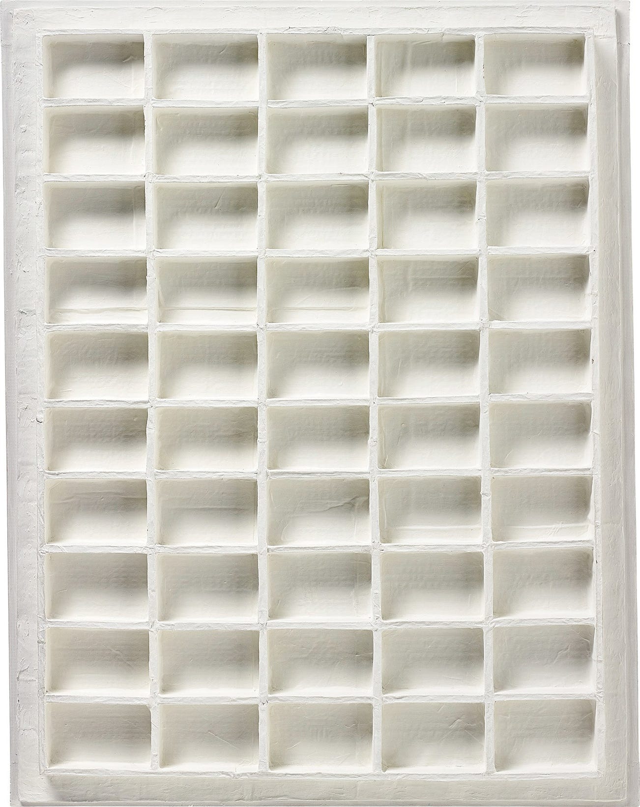 The grid format and application of the uniformed colour white allowed Schoonhoven to democratise his works, its systematic form impeding expression and prejudice. The method of the relief and its subsequent meaning lies in its isolation of concentrated and thematised forms. Schoonhoven commented on the single theme on which he based his works as ‘a gradual vertical division of parallel horizontal cells’ (Antoon Melissen, Jan Schoonhoven, Rotterdam, 2015, pp. 128, 132-133). The uniformity of the divided rectangles is made humane by the handmade technique. ‘Despite their minimal form and colour, there’s no boring monotony. Firstly, there is a sense of it being a manuscript, in which the handmade quality is almost tangible’ (Rudi Fuchs quoted in Jan Schoonhoven, exh. cat., David Zwirner, New York, 2015, p. 8). Indeed, upon being bestowed the honour of the 1967 Bienal de São Paulo, his white relief works were considered ‘by far the most sensitive three-dimensional works in the biennale’ (Antoon Melissen, Jan Schoonhoven, Rotterdam, 2015, p. 107).