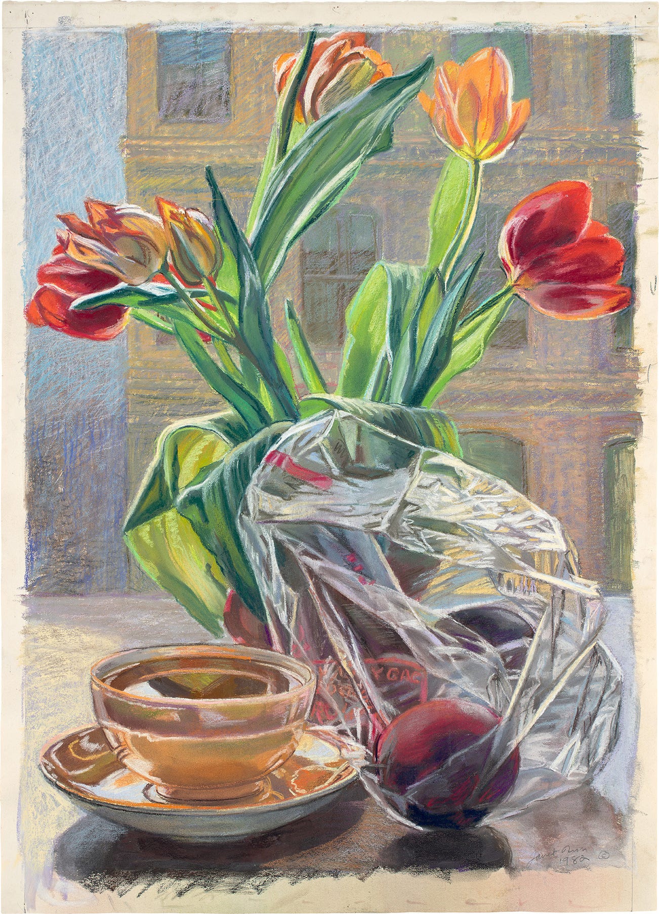 Her interest in light is also expressed through her common depiction of vessels holding liquid such as the coffee cup in the present lot. The cup with its thick glaze seems to serve as a light source for the entire composition though through the window one can make out a bright and sunny city street scene below. Her interest in how these simple, everyday objects refract light is evident and pay homage to the 17th century still-lives painted by the Dutch master’s like Abraham van Beijeren and Johannes van der Beeck, even the tulips make reference to the Dutch tradition of still life painting. Her brushwork however calls to mind a more abstract touch adding movement to her seemingly still paintings, she could not fully embrace abstraction and says she “preferred the physical presence of objects” which in this still life is tulips, a coffee cup and apples juxtaposed again a seemingly never still, outside world.