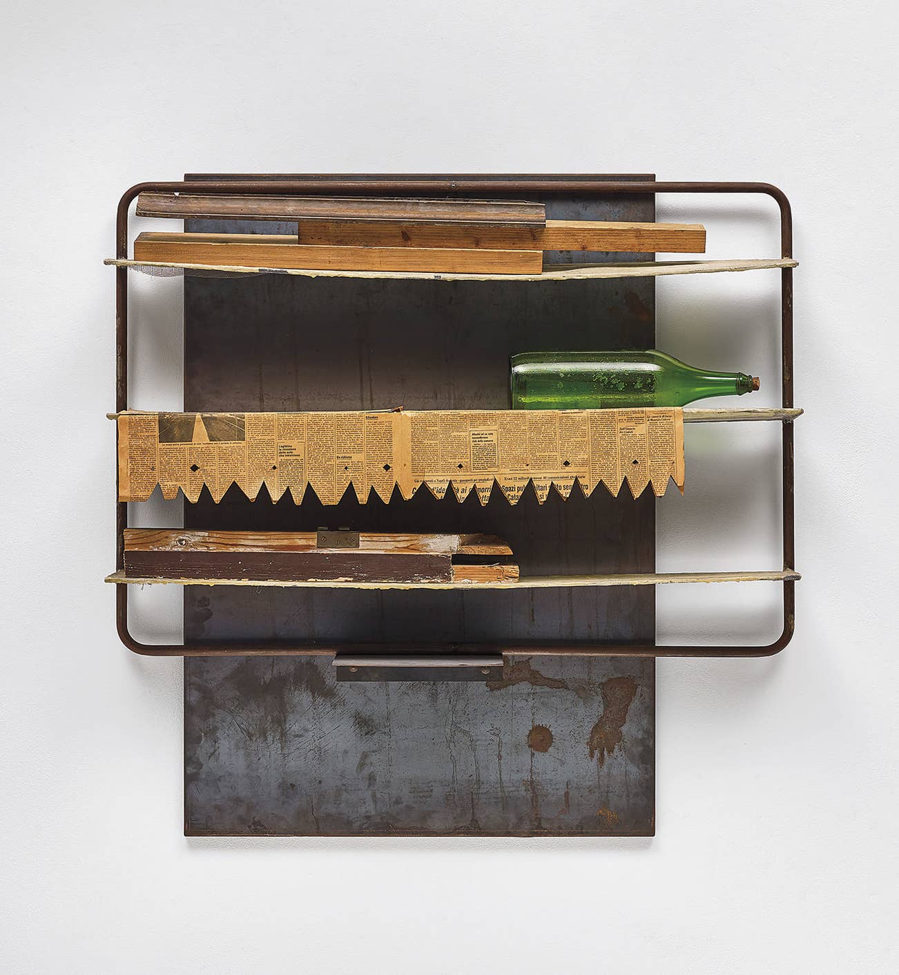 steel panel, mesh, wax, newspaper, glass bottle and wood