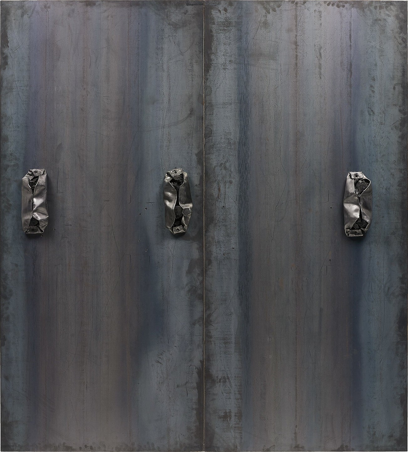 In 1956, Kounellis left his homeland to settle in Rome, and would not return to Greece, or indeed speak his mother tongue, for over two decades. On a par with other Arte Povera protagonists, he would use raw, industrial, or organic materials to render his cross-genre structures; as a result, the uncannily raw dimensions of his work bring to mind those employed by artists such as Alberto Burri or Salvatore Scarpitta, whose perceptions of war also deeply influenced their practice. Having had his first solo show in 1960 at Galleria La Tartaruga in Rome, Kounellis’ inventive creations became increasingly radical in 1967, when he began embracing concrete elements such as soil, wool, coal, cotton and fire, as well as motifs of gravity and equilibrium. It wasn’t until the 1980s and 1990s, however, that he developed a deeper dialogue with architectural and urban spaces, and created wall-based sculptures that comprised his signature combination of industrial materials and specific measurements. ‘I do use metal sheets but I adapt them to a particular format – 2 x 1,80 meters – which more or less corresponds to the surface area of a double bed’, the artist declared. ‘That is a universal dimension, like the height of a table, the width of the door […] and the bed, the door, the table are disciplined by human need. I am interested in working with such measurements’ (Jannis Kounellis, quoted in Jannis Kounellis, exh. cat., Fondazione Prada Venezia, Milan, 2019, n.p.). The present work, standing halfway between a painting and a sculpture, aptly exemplifies this approach: with its three lead and coal excrescences protruding from a split iron surface, the layered composition becomes enigmatically alluring, projected into a tangible realm that shifts the spectator’s phenomenological perspective.