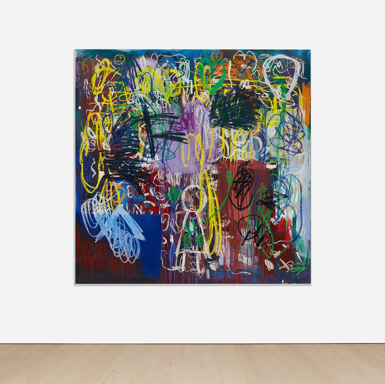 oil, oilstick, enamel, permanent marker, pastel, acrylic, charcoal and graphite on canvas