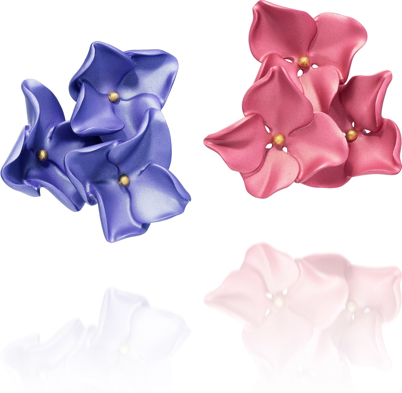 Each designed as three hydrangea flowerheads, featuring mismatched pink and purple petals, and gold colour sepals, mounted in aluminium, titanium and pink gold, omega back, signed JAR, numbered, French assay mark, length approximately 48 mm, pouch stamped JAR.