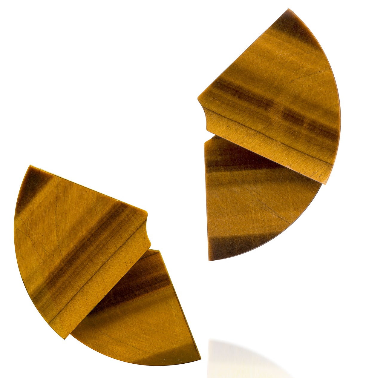 Of hinged design, each composed of two fan-shaped tiger's eye plaques, signed JAR, numbered, length and width approximately 38 mm and 74 mm respectively, pouch stamped JAR.