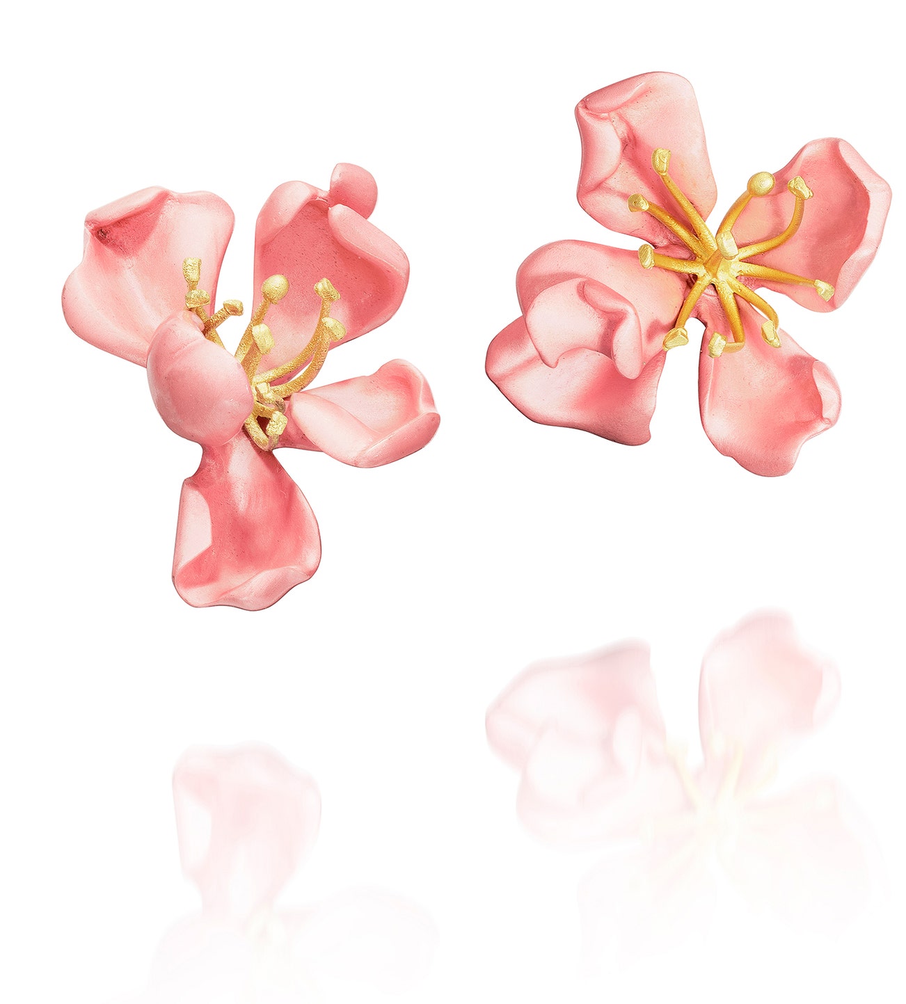 Designed as a pair of almond blossoms, composed of sculpted silver petals applied with pink enamel and gold pistils, mounted in silver and pink gold, omega back, signed JAR, numbered, French assay mark, length approximately 28 mm and 30 mm respectively, pouch stamped JAR.