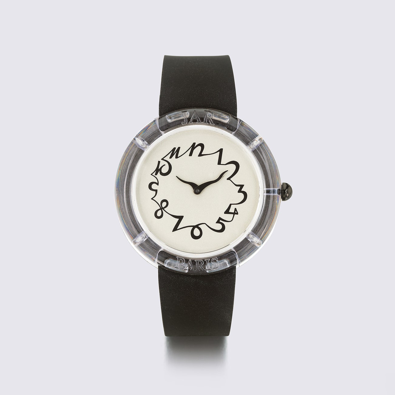 Set with a black silicone watch strap, a silver colored face, and a clear Perspex acrylic bezel, dial with joined Arabic numerals and curved hands, mounted in stainless steel, quartz movement, signed JAR, numbered.