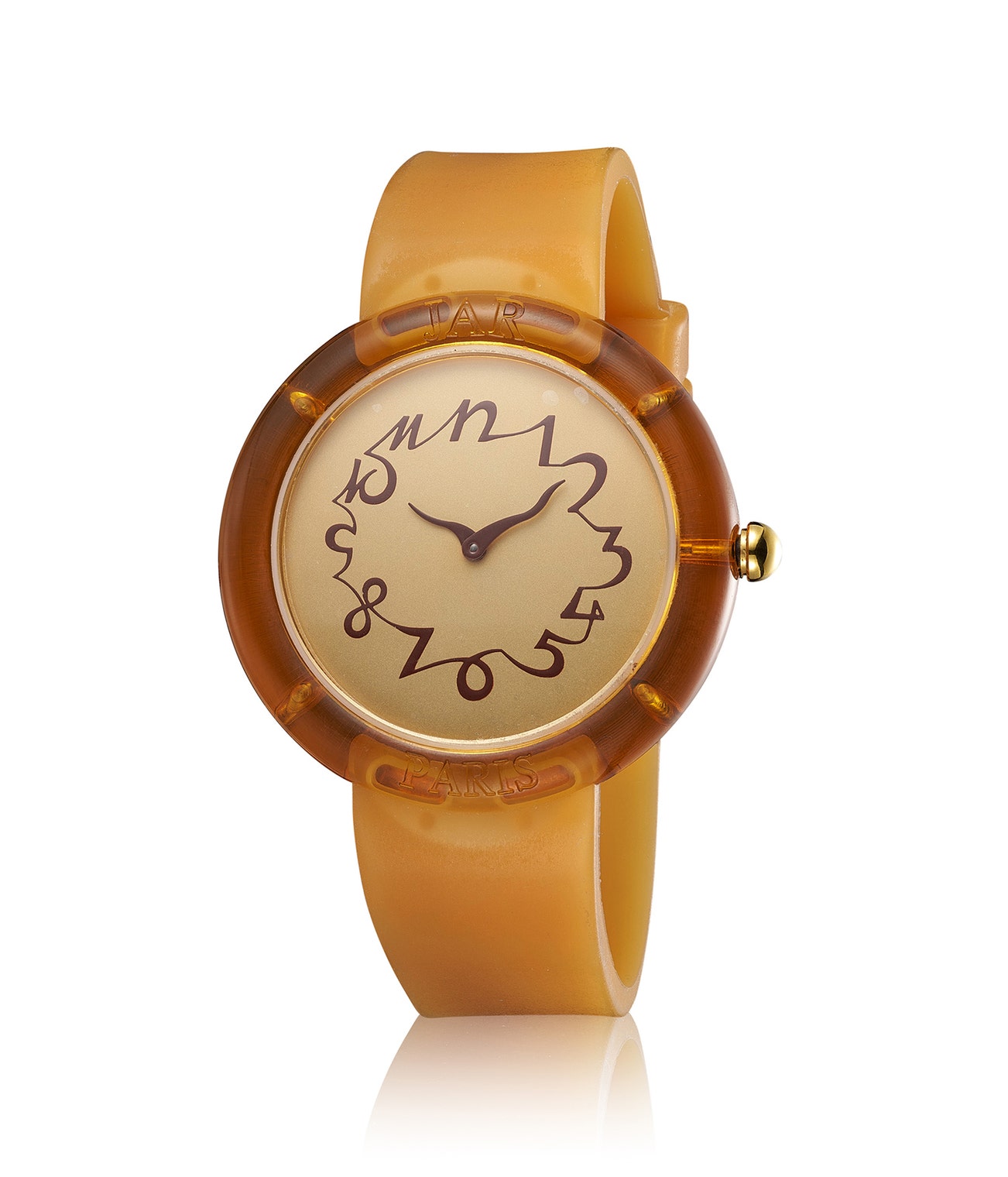 Of quartz movement, champagne dial, Arabic numerals, Perspex bezel, orange silicone strap, gold plated buckle, diameter 40mm, length approximately 230mm, bezel, caseback and buckle signed JAR, numbered, box stamped JAR and The Metropolitan Museum of Art.
