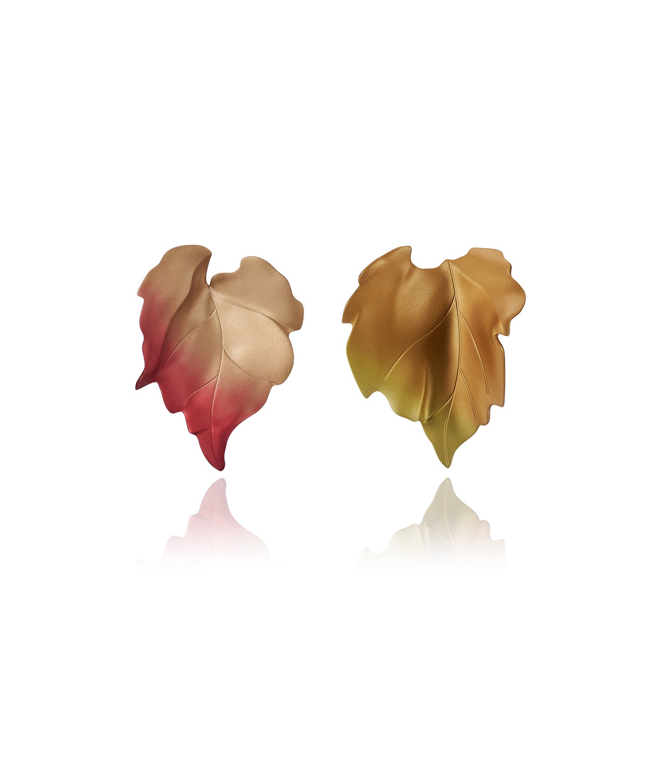 Designed as leaves, one with an orange and yellow finish, the other with a pale pink and red finish, measuring approximately 65 x 50mm, signed JAR, numbered, the clips with French maker's mark and assay mark for gold, pouch stamped JAR.