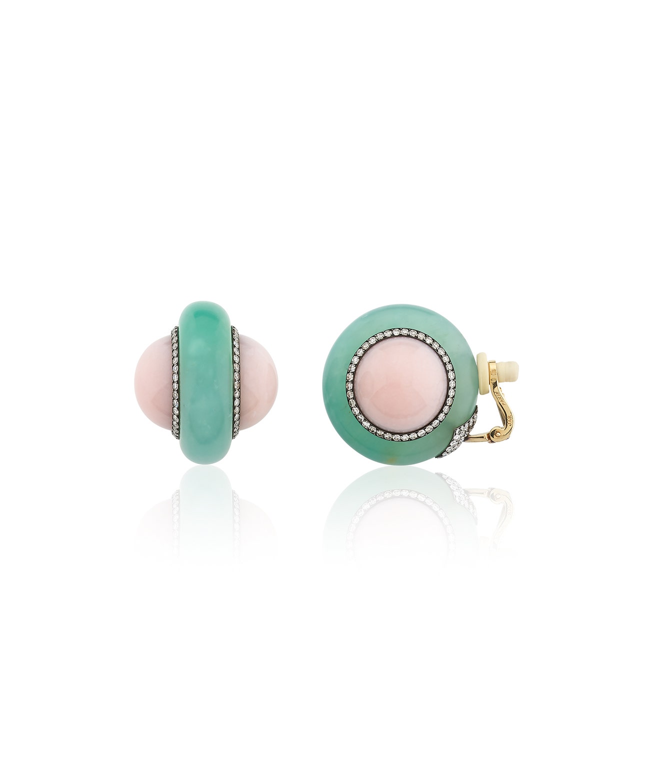 Pair of chalcedony, pink opal and diamond ear clips