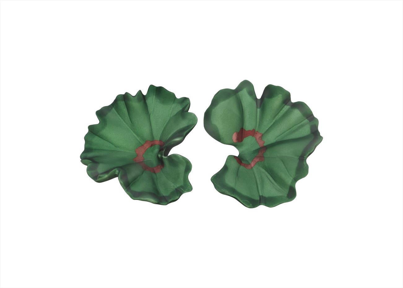 Each designed as a sculpted two-tone green geranium flower, centering on a purple circle accent, mounted in 18K yellow gold and titanium, length 1 1/2 inches.