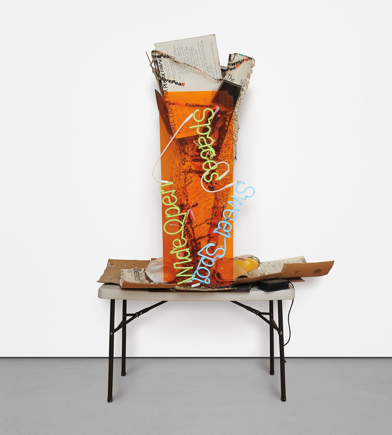 two neon phrases with transformer and power cord, orange Plexiglas panel, PeaRoeFoam, cardboard and rubber boot on Lifetime folding table