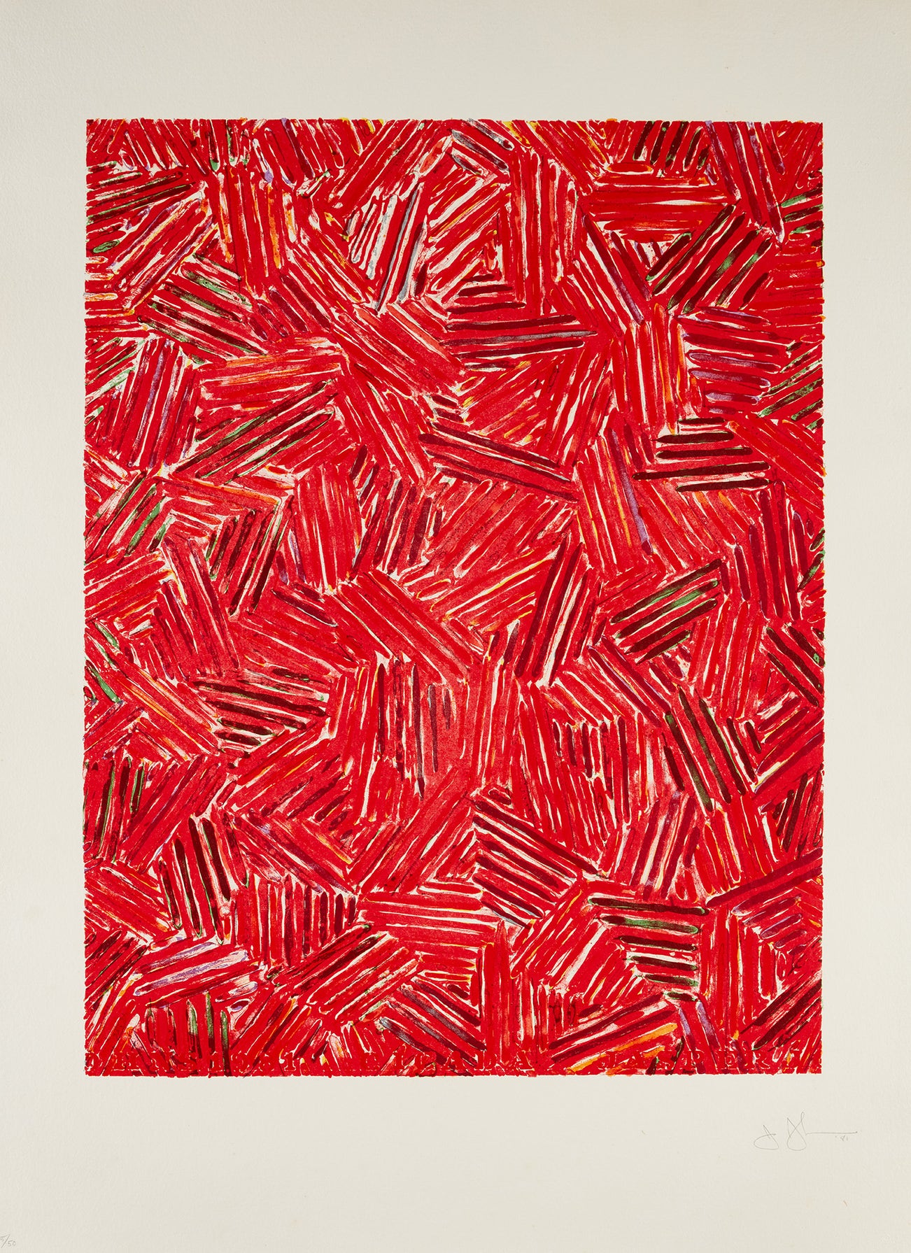 American | 1930Jasper Johns is a painter and printmaker who holds a foundational place in twentieth century art history. Quoting the evocative gestural brushstroke of the Abstract Expressionists, Johns represented common objects such as flags, targets, masks, maps and numbers: He sought to explore things "seen and not looked at, not examined" in pictorial form. Drawing from common commercial and 'readymade' objects, such as newspaper clippings, Ballantine Ale and Savarin Coffee cans, Johns was a bridge to Pop, Dada and Conceptual art movements.