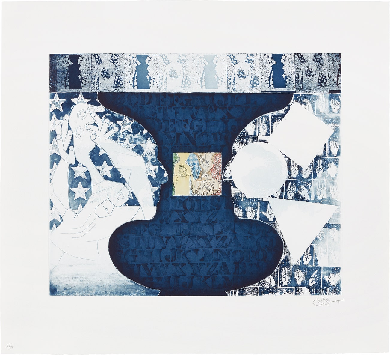 Beyond the historical significance, each work by Johns is individually considered in sensuous form. A curiosity of medium led him to employ a range of materials from encaustic and commercial house paint to lithography, intaglio and lead relief.