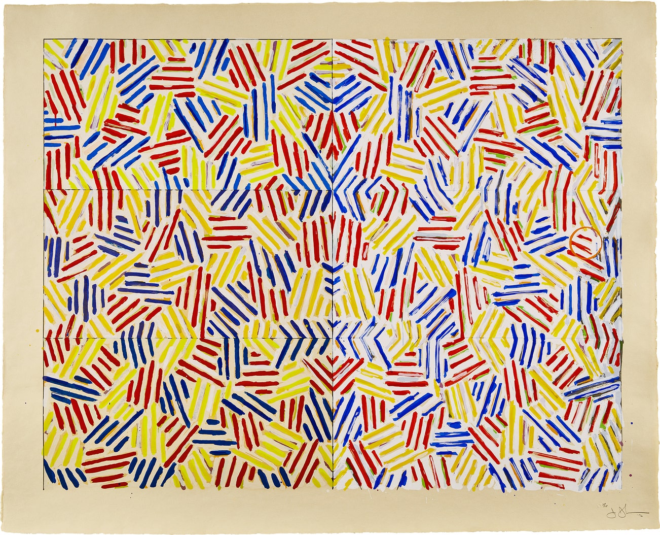 American | 1930Jasper Johns is a painter and printmaker who holds a foundational place in twentieth century art history. Quoting the evocative gestural brushstroke of the Abstract Expressionists, Johns represented common objects such as flags, targets, masks, maps and numbers: He sought to explore things "seen and not looked at, not examined" in pictorial form. Drawing from common commercial and 'readymade' objects, such as newspaper clippings, Ballantine Ale and Savarin Coffee cans, Johns was a bridge to Pop, Dada and Conceptual art movements.