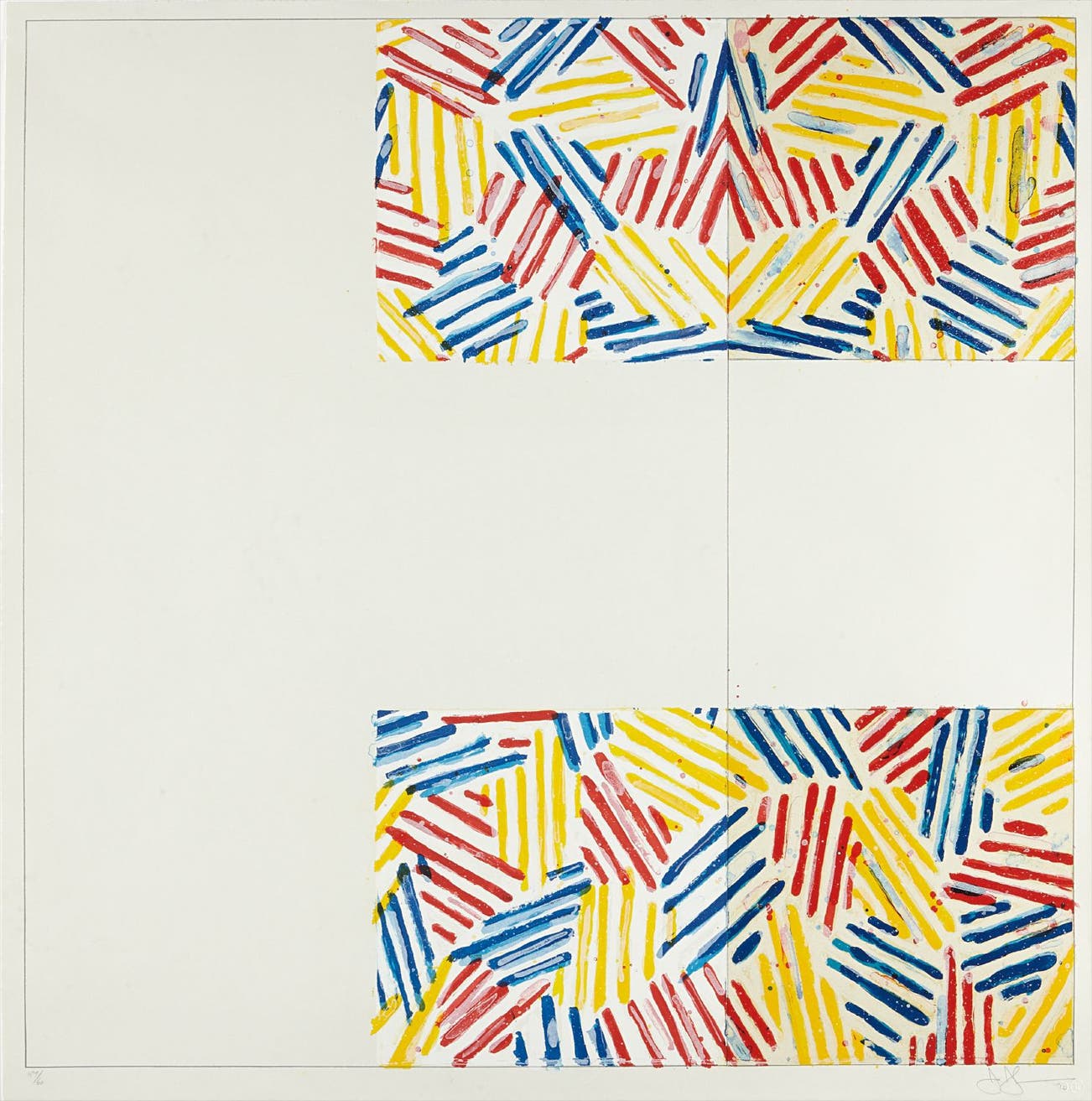 American | 1930Jasper Johns is a painter and printmaker who holds a foundational place in twentieth century art history. Quoting the evocative gestural brushstroke of the Abstract Expressionists, Johns represented common objects such as flags, targets, masks, maps and numbers: He sought to explore things "seen and not looked at, not examined" in pictorial form. Drawing from common commercial and 'readymade' objects, such as newspaper clippings, Ballantine Ale and Savarin Coffee cans, Johns was a bridge to Pop, Dada and Conceptual art movements.