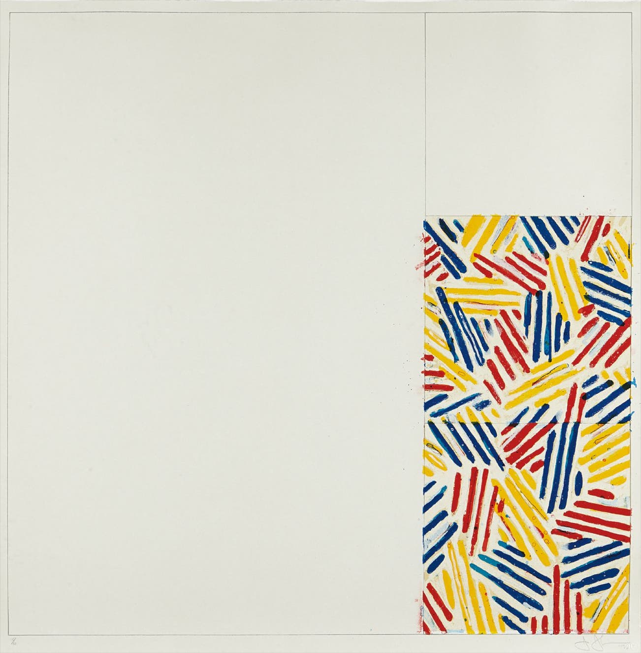 American | 1930Jasper Johns is a painter and printmaker who holds a foundational place in twentieth century art history. Quoting the evocative gestural brushstroke of the Abstract Expressionists, Johns represented common objects such as flags, targets, masks, maps and numbers: He sought to explore things "seen and not looked at, not examined" in pictorial form. Drawing from common commercial and 'readymade' objects, such as newspaper clippings, Ballantine Ale and Savarin Coffee cans, Johns was a bridge to Pop, Dada and Conceptual art movements.