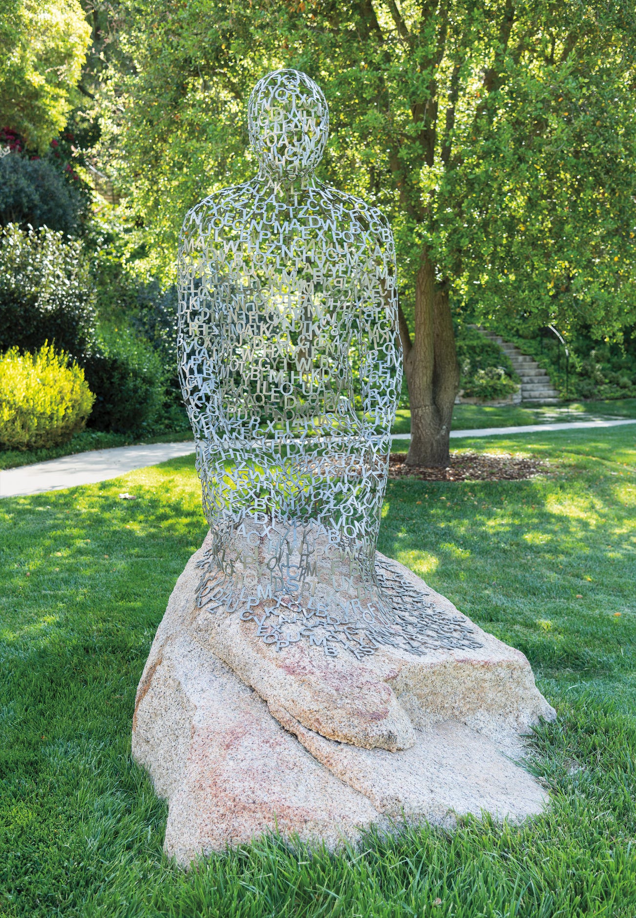 Barcelona native Jaume Plensa is renowned for his monumental sculptures and public installations, which are widely exhibited across the globe. Plensa's works examine the complexities of human existence, drawing upon connections between spirituality, the human figure, and language as three guiding principles. His sculptures investigate dualities, both in their physicality and in the intellectual themes they probe – exploring notions of inside versus outside, light versus darkness, and nature versus creation. Standing over seven feet tall and composed of stainless steel letters weaved together in fluid form, Kneeled Shadow, 2008, is an elegant personification of these core ideas. The present lot is an autoportrait cast from the artist’s own body, a recurring motif in Plensa’s oeuvre. In this work, a kneeled figure sits with his hands placed on his thighs, resting atop a large boulder grounded in the surrounding environment. The sculpture exudes a sense of tranquility and peace, as the kneeling pose symbolizes a position of rest, according to the artist.