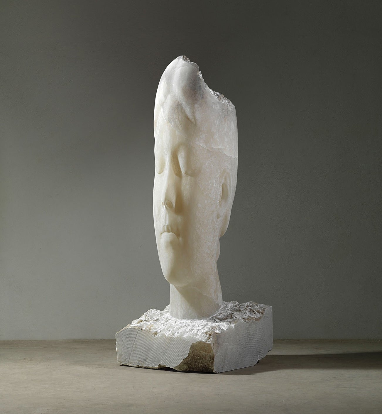 Apart from form, material is equally important to Plensa’s practice. His sculptures lend a physical weight and volume to the spiritual, and transform the environments they inhabit into havens for self-exploration. Executed in pale, semi-translucent alabaster, Anna VI emanates an inner light which, for the artist, is reflective of the soul. To create these sculptures, Plensa utilizes computer modeling to render photographic images three-dimensional, elongating features and manipulating the volume of the face to a level of near-abstraction. In discussing the final product, he notes, “When you finish the portrait you realize you are not doing any specific person, you are making a kind of mural where we can feel reflective. It’s taking this kind of spiritual position, with the eyes closed, as always” (Jaume Plensa, quoted in Ginny Van Alyea, “Interview with Jaume Plensa”, Chicago Gallery News, November 8, 2017, online). Anna VI is a stunning personification of intangibles such as memory, psychology, and serenity, in which Plensa invites the viewer to meditate on his or her own position within the universe at large.