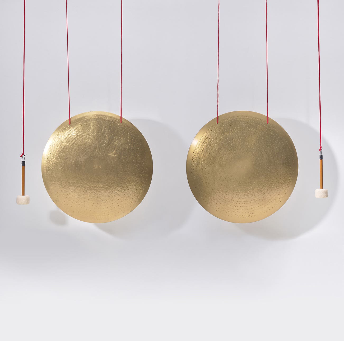 bronze and string with 2 wood, wool and rubber mallets, in 4 parts with 2 accompanying smaller mallets