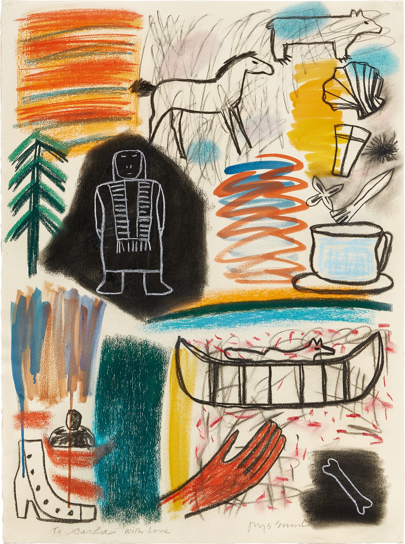 signed “Jaune Smith” lower right; dedicated “To Carla with love” lower left; titled and dated “1989 Summer Journey thru Indian Lands” on the reverse