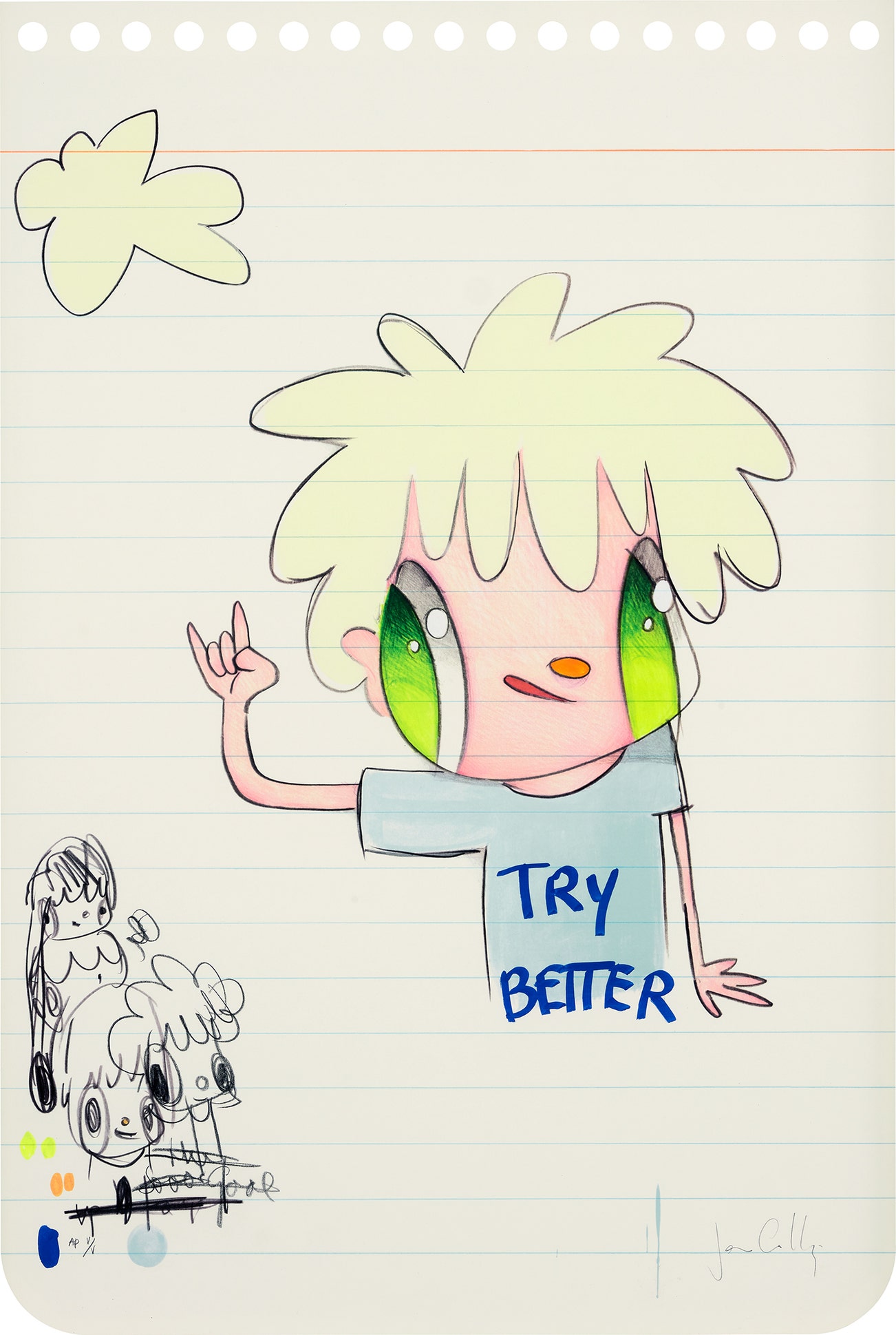 All artist's proofs from this edition are unique and hand-finished. In this case the original 'Up To You' phrase is replaced and inscribed by hand with 'Try Better'. The figures to the lower left of the page are also hand-finished.