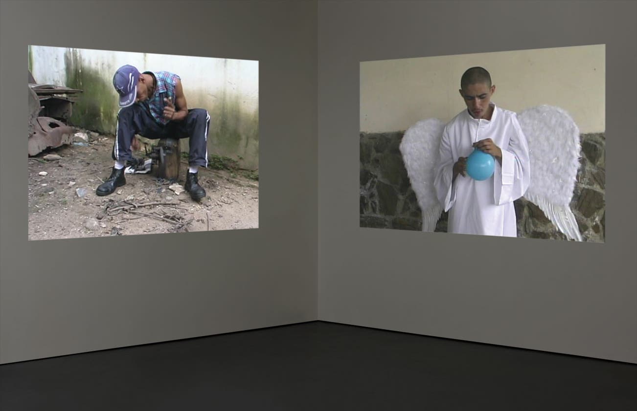 Javier Téllez, a Venezuelan artist from the 1990s generation, focuses his artistic productions on a series of video installations reflecting issues on the art market, institutional power and marginalized populations. He usually works with performers and actors who do not have experience with the arts, as he “prefers to cast the outcast”. Born to a family of psychiatrists, the mentally ill and the politics of mental institutions are a constant subject matter throughout his body of work, emblematized in the present lot, a video installation titled La hora del burro, 2002. This video is projected on two adjacent walls, one showing a schizophrenic patient as an angel blowing a balloon, while the other displays a street knife sharpener sharpening his knives and attracting customers with his special whistle. Their repetitive behaviors are the key to this work — the two channels are synchronized so that every time the knife is sharpened, the angel inflates the balloon. The repetitive scenes present a dramatic behavioral pattern that transcends the realm of art, evoking a social message where “as the knife threatens life, there can be no salvation in the world of corruption and madness.”