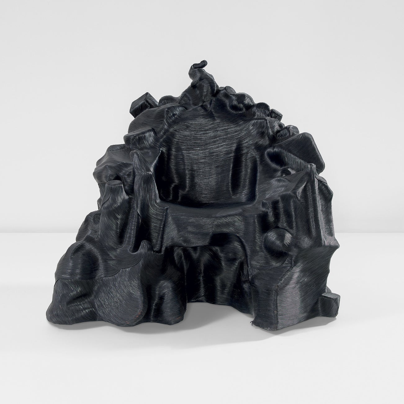 In her Savage Series, Seattle-based artist and industrial designer Jay Sae Jung Oh takes plastic objects and assembles them into sculptural pieces of furniture that she then covers in cords of jute or cowhide leather. The present chair was her first example of a piece covered in cowhide leather. She has created a range of pieces, each unique, from side tables to chairs and sofas. In each example, the wrapped objects are concealed, though their outlines give hints of each object’s identity and previous life. These pieces are intricately made and each requires up to four months to complete. Describing the series as a response to a culture of consumption, the designer said, “discarded objects are reborn as a handcrafted, functional object with high value. It might not be a practical solution for our disposable culture, but I want to suggest another way to solve this issue is by simply changing our attitude and finding beauty in the things that we tend to disregard.” A chair from her Savage Series won the first ever juried awards for “Best in Show’ at Design Miami/ in 2019 and another chair from the series belongs to the permanent collection of the Cranbrook Art Museum, Cranbrook, Bloomfield Hills, Michigan.