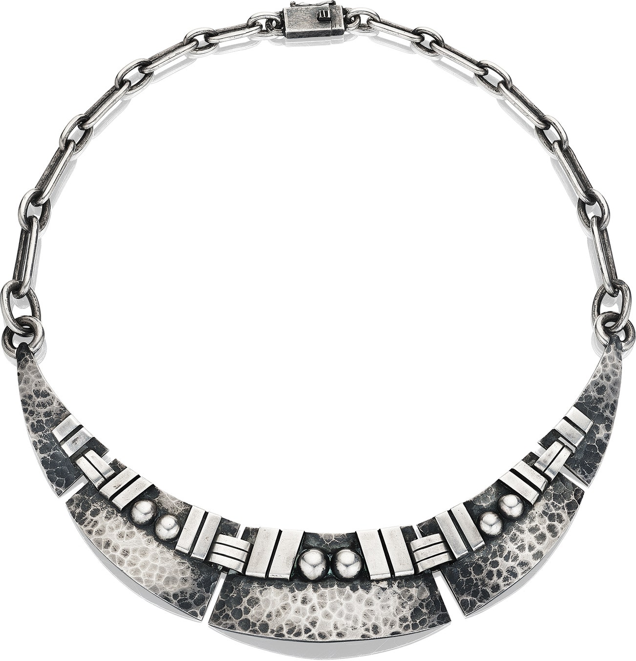 Designed as five tapering hammered plaques, mounted in silver, length approximately 15 7/8 inches, signed J. Deprés, with French assay and maker's mark.