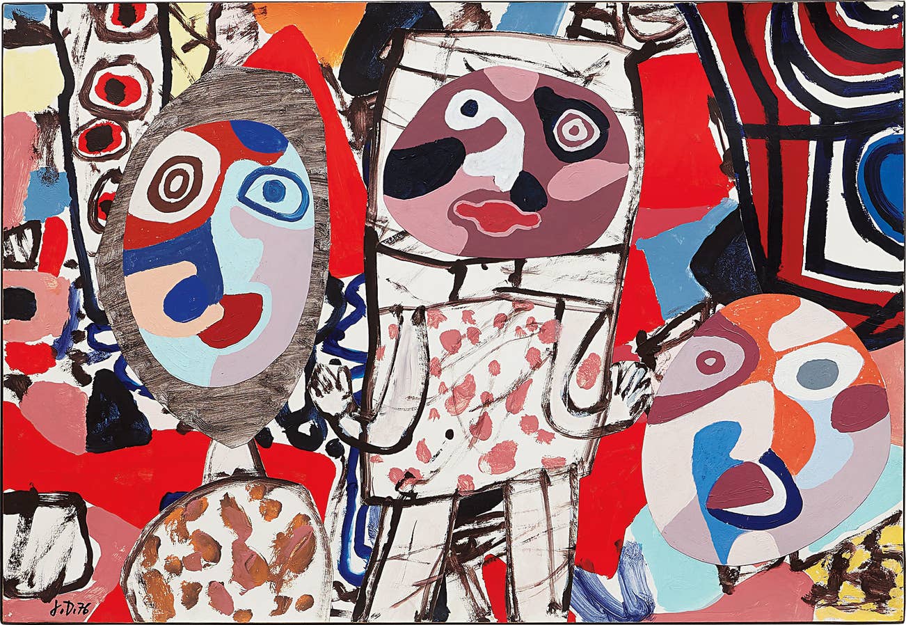 Formerly in the collection of the Solomon R. Guggenheim Foundation, Jean Dubuffet’s Le malentendu, 1976, is a striking example of the artist’s celebrated late series Théâtres de mémoire. With a tongue-in-cheek reference to Albert Camus’ theater play Le Malentendu, Dubuffet has here constructed a heavily layered painterly collage that depicts three figures standing in an indeterminate, abstract landscape. Recalling the frenzied action and kaleidoscope of color of his earlier Paris Circus series as well as the interlocking cellular components of the l’Hourloupe cycle, Le malentendu powerfully encapsulates Dubuffet’s continued nuanced engagement with the theme of mental landscapes to explore the vicissitudes of memory.