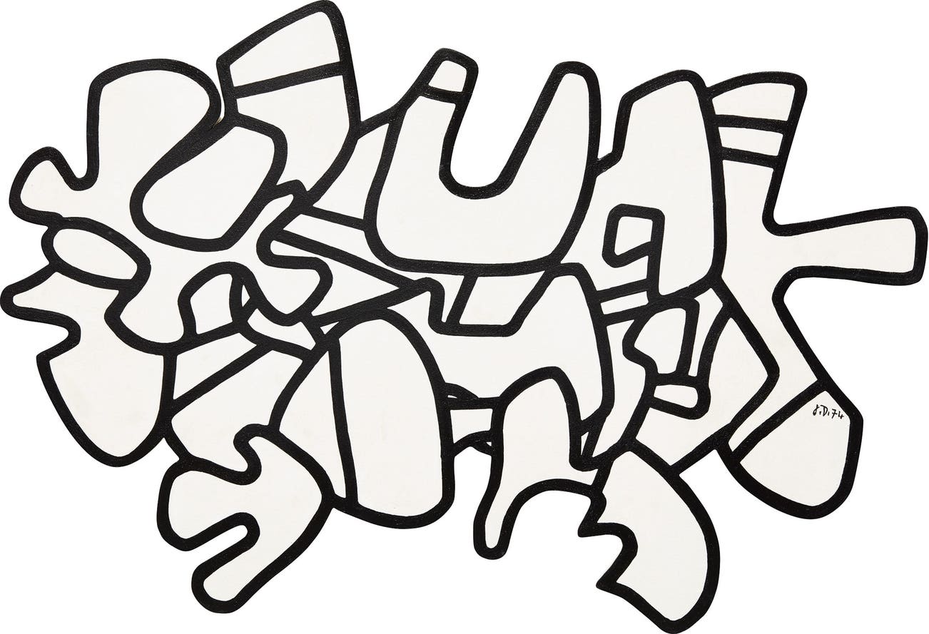 Figure VII transmutes the linearity of Dubuffet’s geometric drawings into a dramatic three-dimensional form that extends off the wall and into the viewers’ physical space. The spontaneous black outlines that encapsulate white space exquisitely illustrate the main themes of the series, begun in 1962 and initially inspired by pen doodles drawn while talking on the telephone. This work embodies a jigsaw-like pattern in which the pieces seem simultaneously calculated and disjointed, evoking an immediacy that engages the viewer. Dubuffet’s work defies traditional creative processes and is not representative of life or nature, but was instead invented from the ideas explored within his own mind. “Ordinary art depicts the perceived world…Whereas…mental space does not resemble three-dimensional perceived space and has no use for such notions such as above or below, in front of or behind, close or distant. [Mental space] presents itself as flowing, whirling, meandering water and therefore its transcription requires entirely different devices from those deemed appropriate for transcribing the perceived world” (Thomas Messer, Jean Dubuffet: A Retrospective, New York, 1973, p. 24).