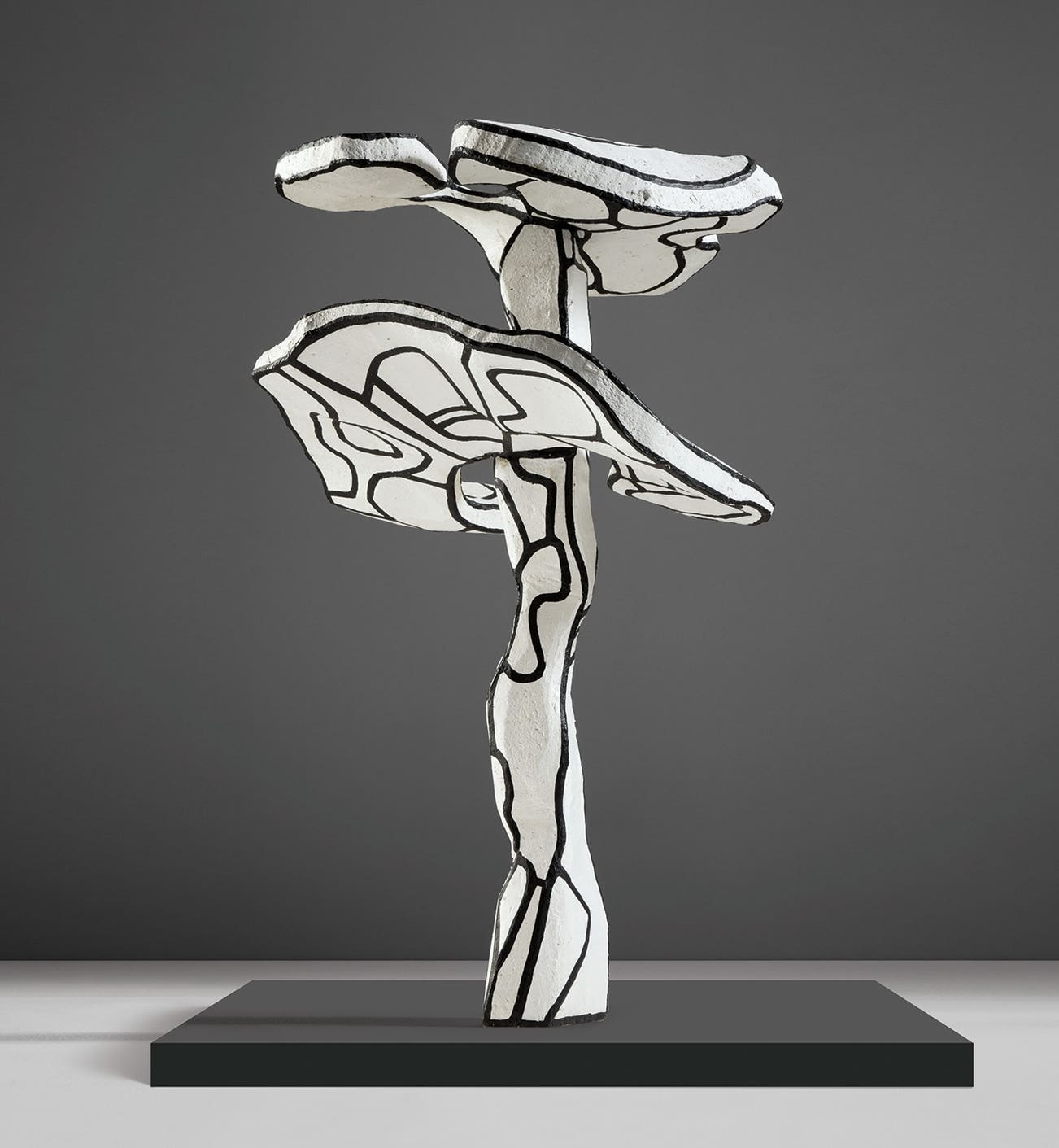 Giving three-dimensional form to Jean Dubuffet’s graphic universe, Arbre aux deux étages, 1970, belongs to the iconic series of sculptures that evolved from the artist’s acclaimed L’Hourloupe cycle. True to the series' instantly recognizable forms covered with bold black line, the work interprets the structure of a two-tiered tree through a jigsaw-like configuration defined by thick black outlines. As one of only around a dozen Arbre sculptures, the present work is intimately connected to Dubuffet’s first monumental public sculpture Groupe de quatre arbres, commissioned by David Rockefeller in 1969 and inaugurated in 1972 at the Chase Manhattan Plaza in New York where it stands to this day.