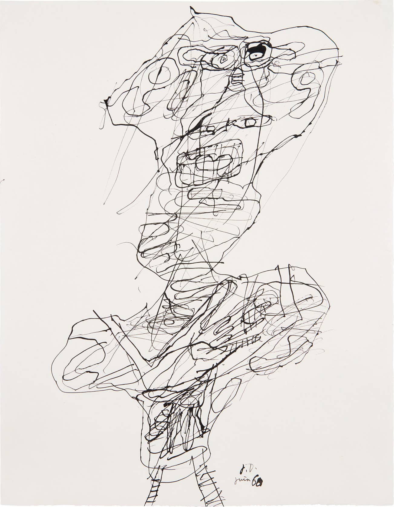 signed with the artist's initials and dated "J.D. juin 60" lower right; further titled and numbered "25 'Personnage'" on the reverse