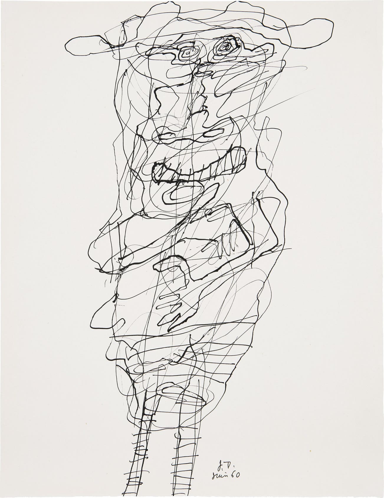 signed with the artist's initials and dated "J.D. juin 60" lower right; further titled and numbered "27 'Personnage'" on the reverse