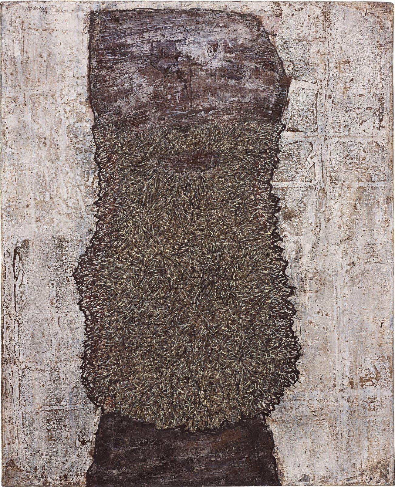 The notion of marrying landscape and portraiture, which Dubuffet explored in the iconic 1950 Corps de dame series featuring women depicted as a flattened, impastoed terrain, would re-emerge almost a decade later in the Barbes. This same notion even bled into Dubuffet's poem La fleur de barbe, which he wrote in 1959, published the following year, and illustrated with five of the early beard pictures. The first image reproduced alongside the poem, the essentially abstract Prairie de barbe, is but a Texturologie by another name while the remaining four works were created by taking pieces of paper painted as Texturologie and arranging them in the form of a bearded man. In that poem, descriptions of the landscape, of the spring coating of fauna, were melded with imagery relating to beards. Barbe des rites perfectly encapsulates this potent mixture with both the frenetic foliage-like thatch of the beard itself, and the more stony backdrop and monolithic neck and face.