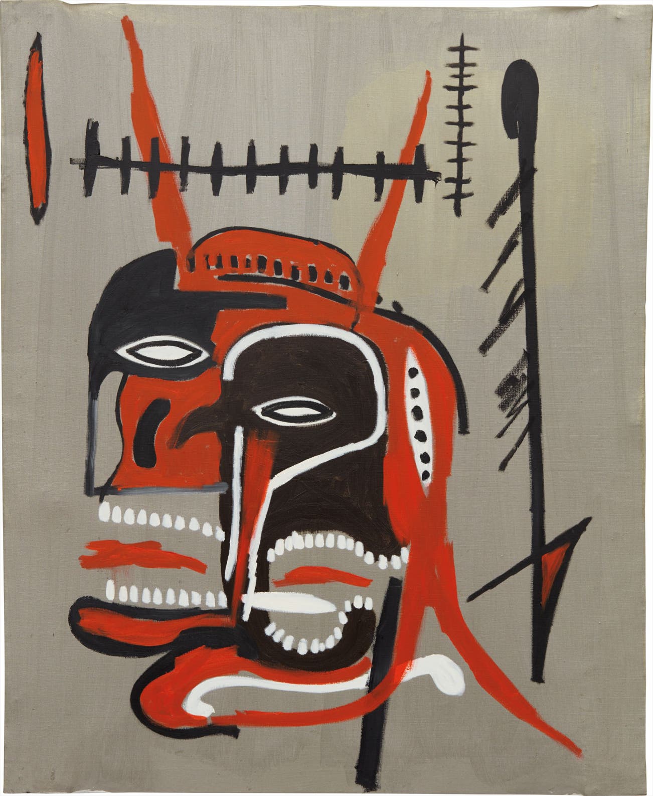 Aesthetically, the present lot reflects the artist’s two key influences pulled from throughout his oeuvre. The skull harkens back to one of Basquiat’s first sources, a book on anatomy given to him by his mother in 1968 after surviving an almost-fatal car accident. While abstract, Basquiat’s skulls are rendered with a semblance of scientific accuracy in their structure and emphasis on the individual parts that make up the body, evident here in his rendering of the teeth and nasal cavities. Like Francis Bacon, there exists a psychological pulse in the stylized way that this anatomical influence was expressed, belonging to the unique intersection of abstraction and figuration. In Untitled (Devil’s head), Basquiat also harkens back to the art historical canon with which he was so fascinated, not only in the tribal motifs exhibited in the contours of the skulls’ heads and the arrow-like lines framing the composition, but also in the metallic surface of the background, which recalls Renaissance compositions and Byzantine mosaics.