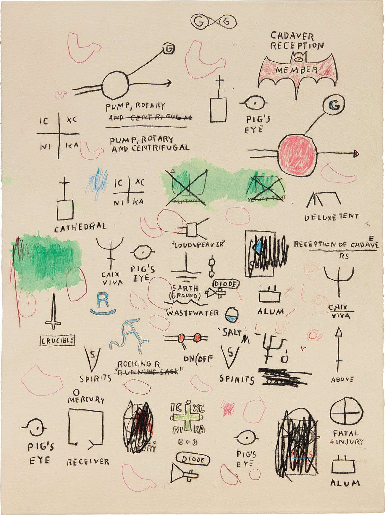 Drawing held a very special place within the artist’s oeuvre, as he was attracted to the immediacy of the medium and its similarities to the unbridled nature of his origins as a graffiti artist. Rather than laboring over his works for extended periods of time, Basquiat is famous for saying, “I start a picture and I finish it.” Untitled was executed in this very manner – a candid recording of hieroglyphics and phrases – drawn in the artist’s typical, primitive style. The primary source for many of these symbols was Henry Dreyfuss’ Symbol Sourcebook: An Authoritative Guide to International Graphic Symbols published in 1972. Basquiat studied this textbook at length and integrated many of the motifs he saw directly into the narrative of his works. In Untitled, “PUMP, ROTARY AND CENTRIFUGAL” and “FATAL INJURY” seem to leap off the page. Intertwined with these phrases are the graphic symbols Dreyfus codified, such as the circle with a diagonal line protruding from the top corner with a “G” at the end. Additional recognizable motifs like the Batman logo, pig’s eye, and sword punctuate the composition, interspersed with a few bright green swaths of watercolor, and scattered blue and red scribbles that feel almost automatic or subliminal.