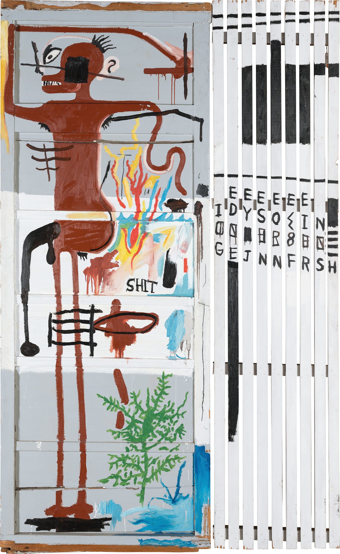 Basquiat’s paintings were a ‘calculated improvisation’; like beat poets who composed their writing from shredded scraps, he remixed his materials and themes compulsively and instinctively, working on multiple projects at once in his studio using found materials, oilstick, crayons, spray paint, pencil and acrylic paints at the same time. When he couldn't afford canvases, he fashioned them out of discarded wood found on the street, and consequently Thermopolae is an ironic ‘diptych’ fashioned from a repurposed door and fence.