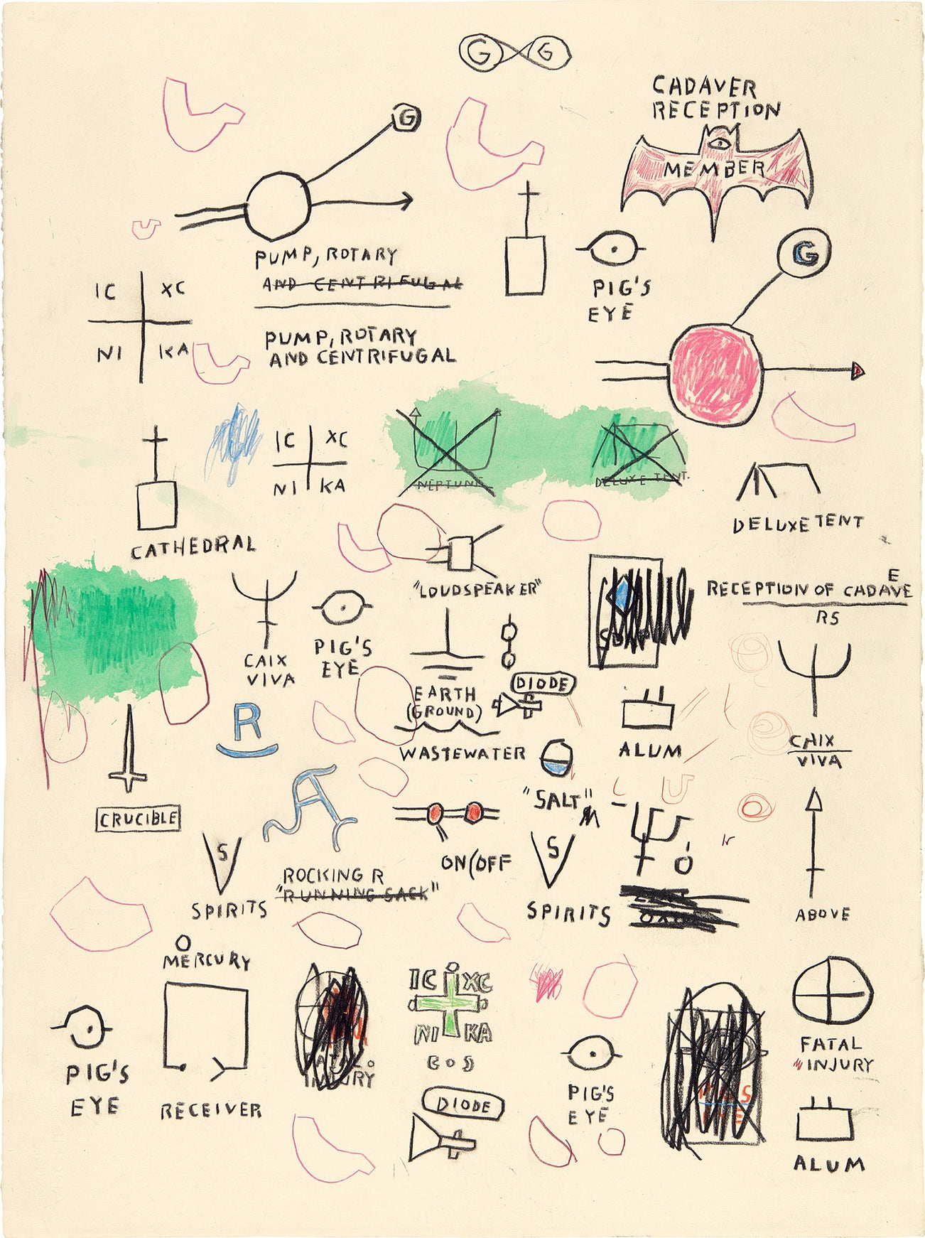 Basquiat's iconoclastic oeuvre revolves around the human figure. Exploiting the creative potential of free association and past experience, he created deeply personal, often autobiographical, images by drawing liberally from such disparate fields as urban street culture, music, poetry, Christian iconography, African-American and Aztec cultural histories and a broad range of art historical sources.